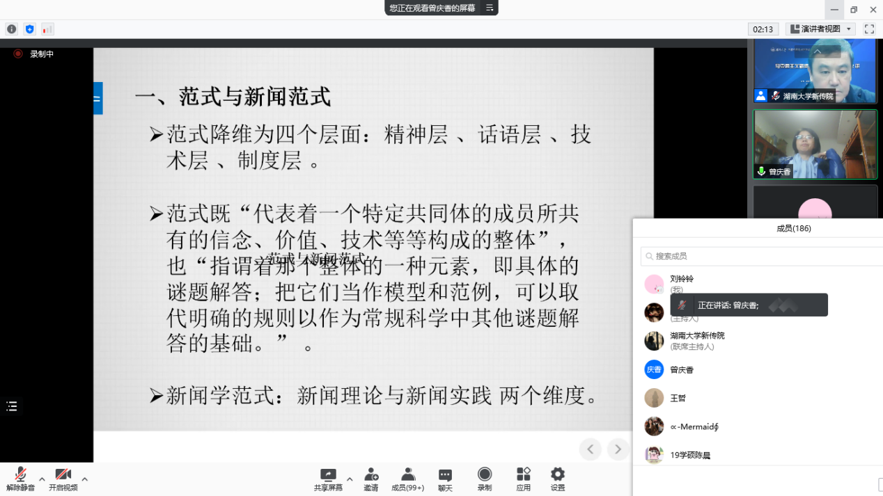 11月9日下午,岳麓传媒论坛第98期于“云端”腾讯会议室举行。此次学术讲座以“中国特色社会主义新闻学的新闻范式:宣传、专业、交往”为主题,由中国社会科学院新闻与传播研究所研究员、博士生导师曾庆香担任主讲嘉宾,大学生做爱