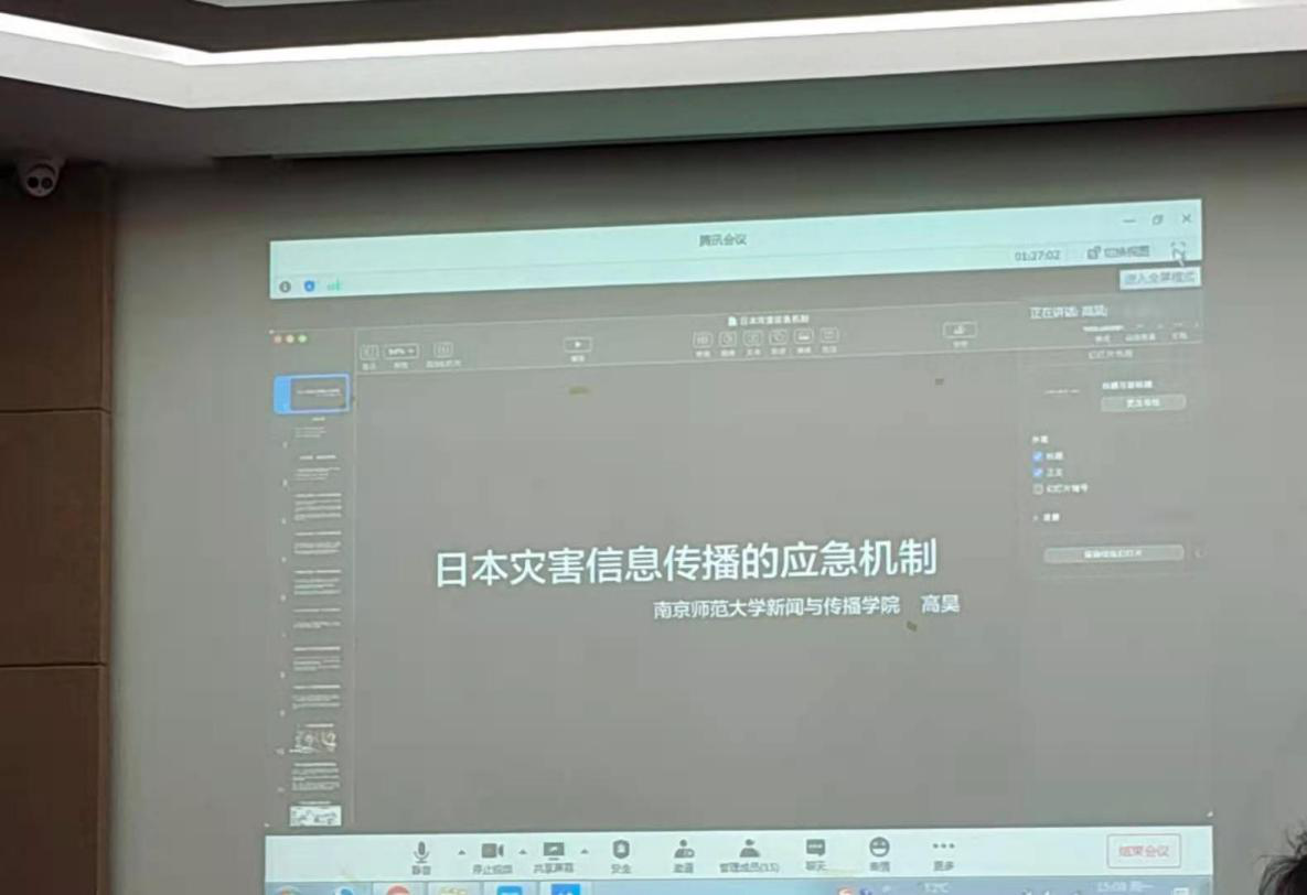 随后,课题组成员南京师范大学高昊副教授从“日本灾害信息传播的应急机制”角度切入,从法律法规体系和灾害瞬时警报体系的建立、媒体灾害应急制度和灾害报道规范的制定、媒体灾害信息传播的实践经验等三个层面,展开讲述。