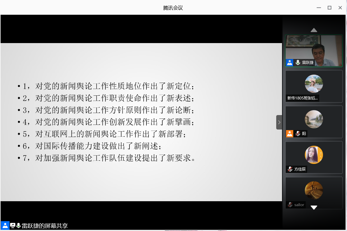马克思主义新闻观研究中心于“云端”腾讯会议室举办了一场特殊形式的学术讲座。作为岳麓传媒论坛马克思主义新闻观主题系列讲座的开篇之作,此次学术讲座以“马克思主义新闻观中国化的当代探索”为主题,由新影院特聘教授、岳麓学者雷跃捷教授担任主讲嘉宾,新影院副院长阳美燕教授担任主持人,学院师生200余人参与。