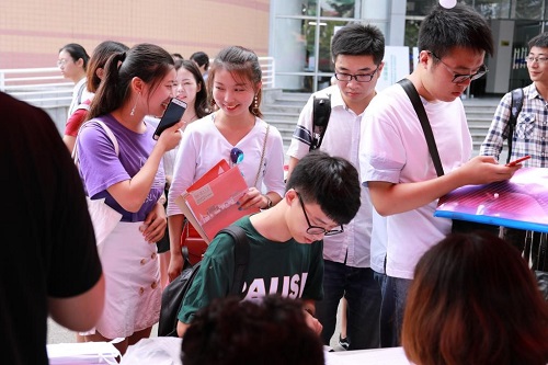 在财院校区二教对面设置的迎新点前,已经陆陆续续有新生排队报道。