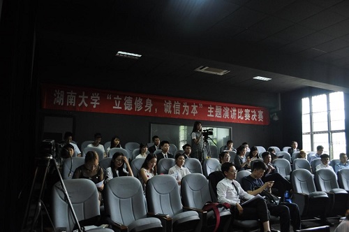 来自15个学院的21名选手齐聚新影院,给大家带来了一场听觉的盛宴。比赛中,湖大学子们尽情地发挥自己的想象力和创造力,独特的视角和严谨的逻辑阐述“立德修身,诚信为本”。有的同学借古人之言,向大家讲述诚信是中华民族的传统美德;有的同学结合自己的亲身经历,将诚信与母校培养教育联系在一起,把母校对自己的诚信教育展示出来,既表达了对母校的热爱之情,又升华了主题;有的同学以最近发生的社会热点与时事作为切入点,引起大家共鸣的同时也调动了现场观众的热情。