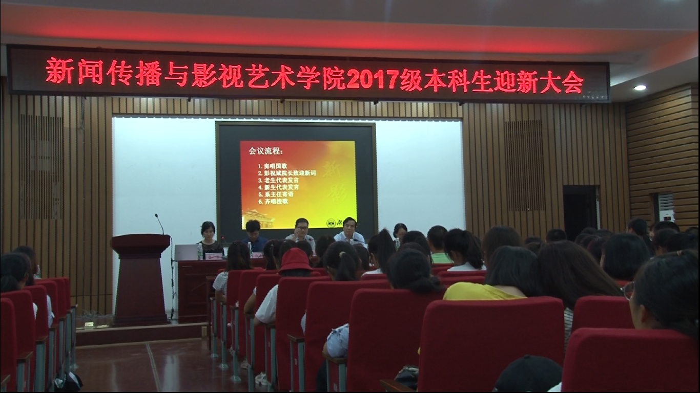 9月19日下午两点半,新闻传播与影视艺术学院在北楼217教室举行2017级本科新生迎新大会。学院院长彭祝斌教授、党委书记兼副院长赵智勇老师、副院长向志强教授、党委委员戴松副教授、各系系主任、17级班主任以及教务办个学工办的全体老师等出席本次会议,院党委副书记兼副院长程华副教授主持会议,2017级全体本科生参加会议。