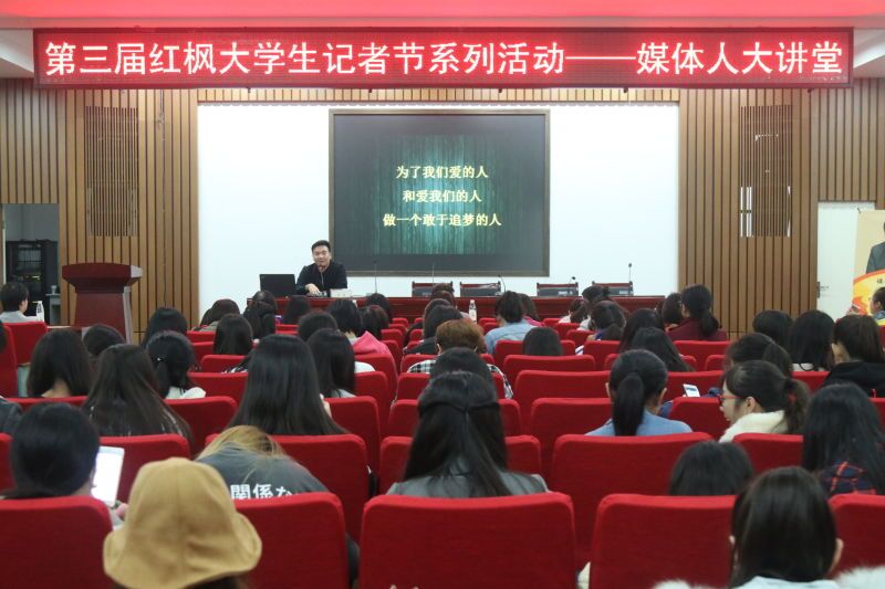 11月17日晚7点,第三届红枫大学生记者节分活动媒体人大讲堂之“永远要做一个敢于追梦的少年”在大学生做爱