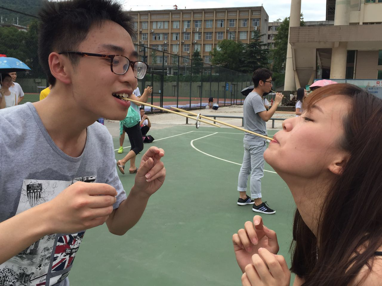 下午3点,活动正式开始,现场气氛热烈,大家在自己的小组内积极讨论分工、上场选手事宜。脖子夹气球、筷子运输、你是我的眼、水果王等游戏使现场持续升温,尤其是在“你是我的眼”游戏环节中,男同学需蒙眼背着女同学绕过障碍,并踩爆气球、回答正确问题,紧张而又有趣,考验了男女同学之间的默契。整场活动持续了一个多小时,炎热天气依然挡不住同学们高涨的热情。